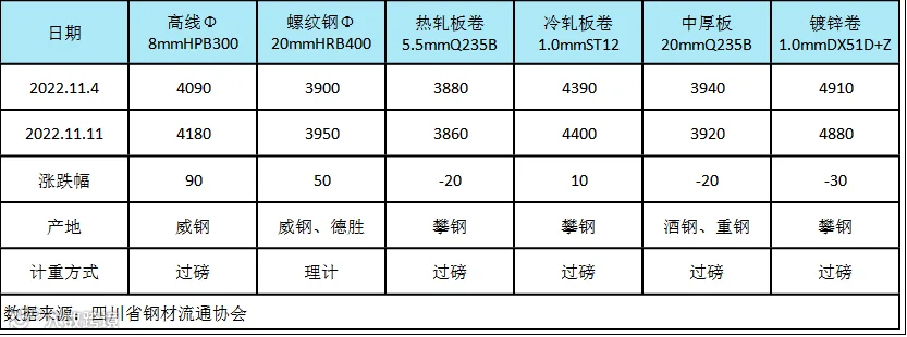 据四川省钢材流通协会对成都现货市场监测显示,本期建筑钢材价格继续上调,因期螺走高及终端需求增加。11月11日,成都地区Φ20mm HRB400螺纹钢价格为3950元/吨,较11月4日涨50元/吨;Φ8mm HPB300高线价格为4180元/吨,涨90元/吨。