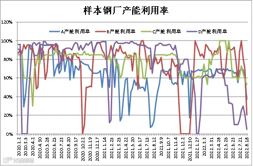 (8月12日-8月18日)四川省钢材流通协会对四家样本钢厂关于建材产能利用率统计数据显示,A、B、C、D较上周分别下调23%、48.32%、5%、15%。