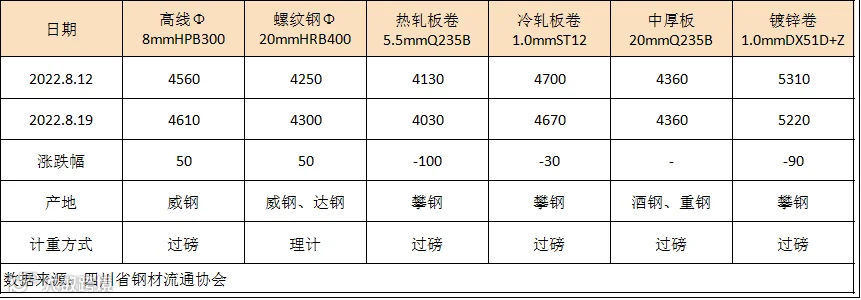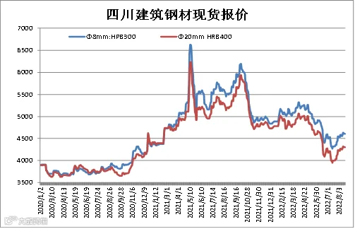 据四川省钢材流通协会对成都现货市场监测显示,本期建筑钢材价格延续震荡偏强,受限电影响钢材产量减少,钢厂挺价情绪较高。8月19日,成都地区Φ20mm HRB400螺纹钢价格为4300元/吨,较8月12日涨50元/吨;Φ8mm HPB300高线价格为4610元/吨,涨50元/吨。