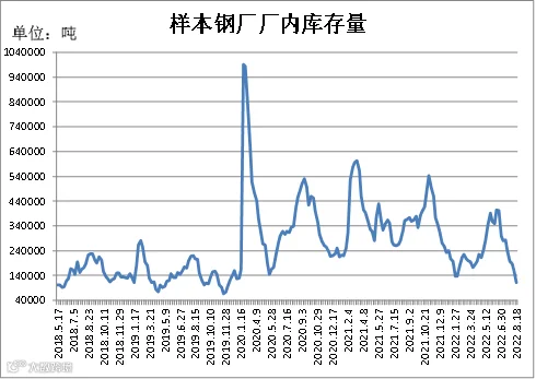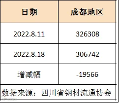 据四川省钢材流通协会统计,截止8月18日成都地区样本库房中螺纹钢及线材库存总量为306742吨,较上周减少19566吨,较去年同期减少332406吨。本期社会库存量继续下滑,因下游需求减弱,商家以降库为主。