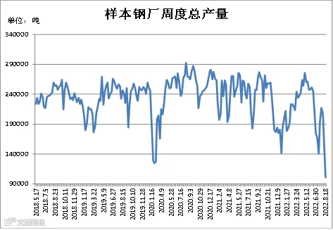 (8月12日-8月18日)四川省钢材流通协会对四家样本钢厂关于建材产量统计数据显示,本周A、B、C、D较上周分别减少13000吨、27060.23吨、9000吨、9500吨。四家样本钢厂总产量为101006吨,周环比减少58560吨。