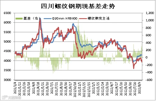 从近五年统计数据显示,成都建筑钢材现货价格与上期所螺纹钢期货价格存较强联动性,基差正常波动区间为0-400元/吨。本周现货价格强于期货,8月19日成都Φ20mmHRB400现货价为4300元/吨,RB2210合约期价为3929元/吨,基差为371元/吨,周环比+271元/吨。(备注:基差=现货-期货)
