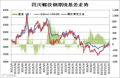 统计数据显示,成都建筑钢材现货价格与上期所螺纹钢期货价格存较强联动性,基差正常波动区间为-100-300元/吨。本周现货价格强于期货,2月3日成都Φ20mmHRB400现货价为4260元/吨,RB2305合约期价为4055元/吨,基差为205元/吨,周环比+188元/吨。