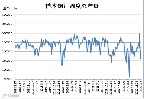 (1月13日-2月3日)四川省钢材流通协会对四家样本钢厂关于建材产量统计数据显示,本周B、C、D较上周分别减少3215.23吨、7000吨、15000吨;A较上周增加10000吨。四家样本钢厂总产量为160049吨,周环比减少15215吨。