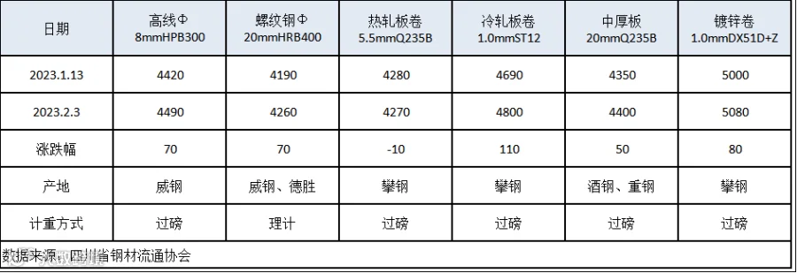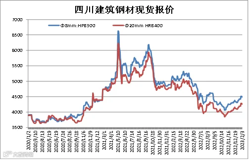 据四川省钢材流通协会对成都现货市场监测显示,本期建筑钢材价格继续上调,由于节后钢厂大力拉涨,市场商家积极跟涨,但多数下游用钢企业还没恢复采购需求。2月3日,成都地区Φ20mm HRB400螺纹钢价格为42600元/吨,较1月13日涨70元/吨;Φ8mm HPB300高线价格为4490元/吨,涨70元/吨。