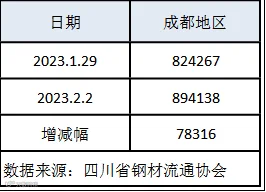 据四川省钢材流通协会统计,截止2月2日成都地区样本库房中螺纹钢及线材库存总量为894138吨,较上周增加69871吨,较去年同期增加78316吨。本期社会库存量继续增加,由于终端需求仍未恢复。