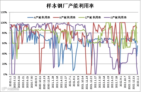 (1月13日-2月3日)四川省钢材流通协会对四家样本钢厂关于建材产能利用率统计数据显示,B、C、D较上周分别下调5.79%、3%、15%;A提升20%。