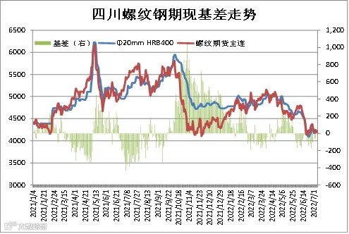从近五年统计数据显示,成都建筑钢材现货价格与上期所螺纹钢期货价格存较强联动性,基差正常波动区间为0-400元/吨。本周现货价格弱于期货,7月8日成都Φ20mmHRB400现货价为4210元/吨,RB2210合约期价为4196元/吨,基差为14元/吨,周环比-1元/吨。(备注:基差=现货-期货)