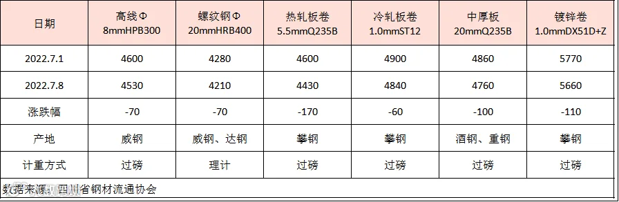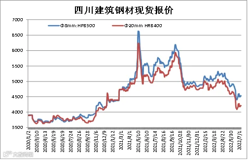 据四川省钢材流通协会对成都现货市场监测显示,本期建筑钢材价格承压下调,因美联储维持鹰派推动美元指数持续走高,大宗商品期货价格普遍承压,另外炉料疲软打压成材。7月8日,成都地区Φ20mm HRB400螺纹钢价格为4210元/吨,较7月1日跌70元/吨;Φ8mm HPB300高线价格为4530元/吨,跌70元/吨。