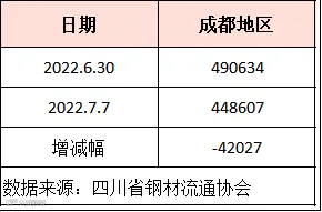 据四川省钢材流通协会统计,截止7月7日成都地区样本库房中螺纹钢及线材库存总量为448607吨,较上周减少42027吨,较去年同期减少24942吨。本期社会库存量继续回落,由于钢厂检修增多,产量下滑,叠加省外资源到货减少。