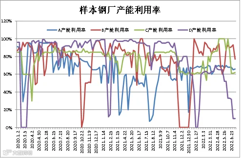 (6月31日-7月7日)四川省钢材流通协会对四家样本钢厂关于建材产能利用率统计数据显示,A、C较上周分别提升1%;B较上周减少15.98%;D较上周持平。