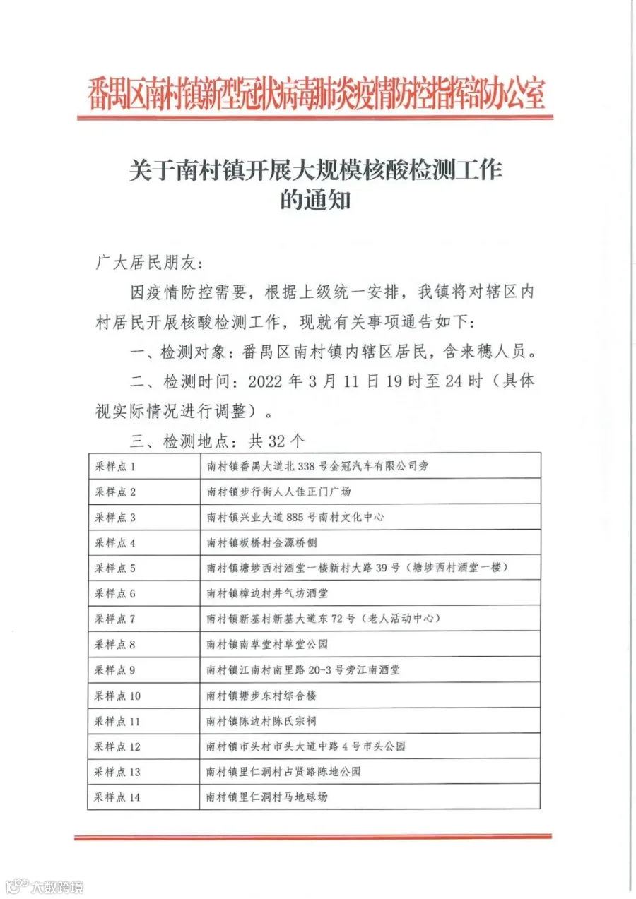 因疫情防控需要,根据上级统一安排,3月11日19时至24时,番禺区南村镇将开展全员核酸检测工作,共设32个检测点,请广大居民积极配合,不信谣、不传谣、不造谣。