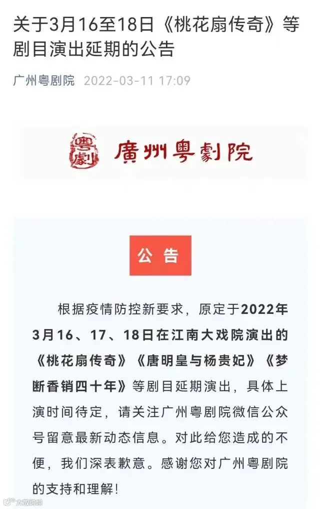 广州粤剧院发布公告称,根据疫情防控新要求,原定于2022年3月16日、17日、18日在江南大戏院演出的《桃花扇传奇》《唐明皇与杨贵妃》《梦断香销四十年》等剧目延期演出,具体上演时间待定,请关注广州粤剧院微信公众号留意最新动态信息。