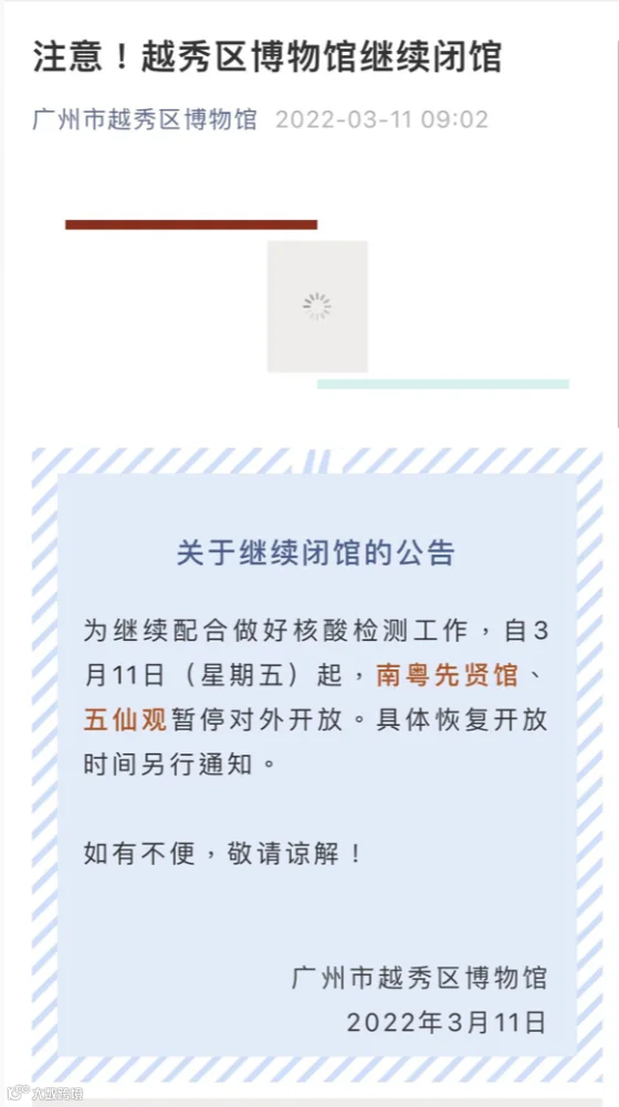 越秀区博物馆发布公告,即日起南粤先贤馆、五仙观暂停对外开放,具体恢复开放时间另行通知。