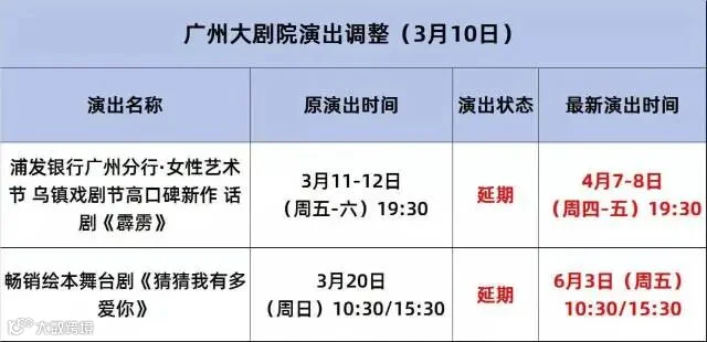 其中,广州大剧院原定于3月11-12日推出的乌镇戏剧节高口碑新作话剧《霹雳》和3月20日畅销绘本舞台剧《猜猜我有多爱你》将延期,延期场次已售出门票依然有效,观众可持原门票入场观演,无需更换;如需退票可联系原购买渠道办理。