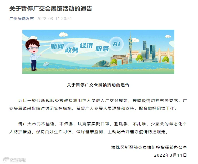 3月11日,广州市海珠区发布通告称,近日一疑似新冠肺炎核酸检测阳性人员进入广交会展馆,按照疫情防控有关要求,广交会展馆采取临时封闭管控措施。请广大市民不信谣、不传谣,认真落实戴口罩、勤洗手、不扎堆、少聚会的常态化个人防护措施,保持良好生活习惯、做好健康监测,主动配合并遵守疫情防控规定。