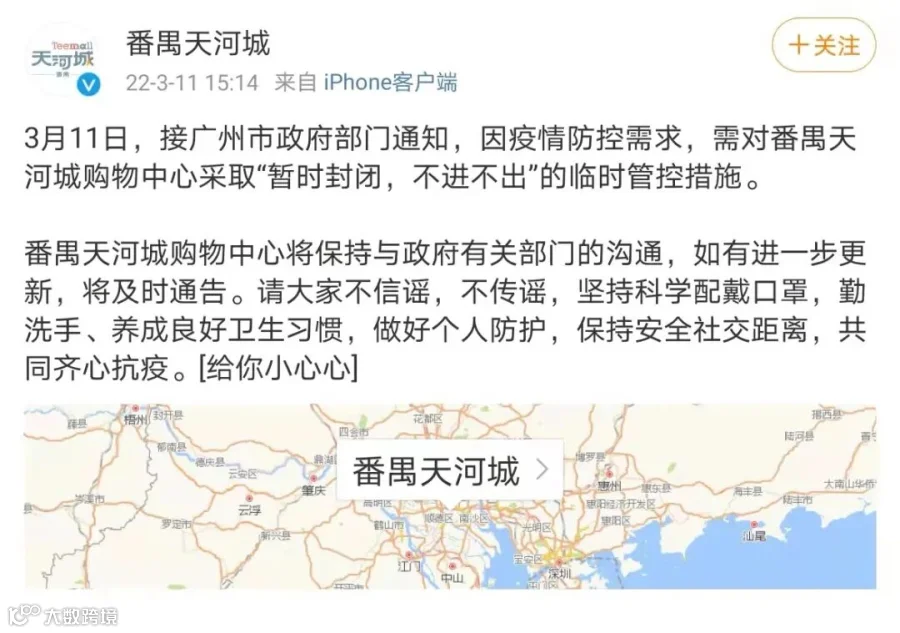 3月11日,番禺天河城在其官方微博发布通知,通知称,接广州市政府部门通知,因疫情防控需求,需对番禺天河城购物中心采取“暂时封闭,不进不出”的临时管控措施。