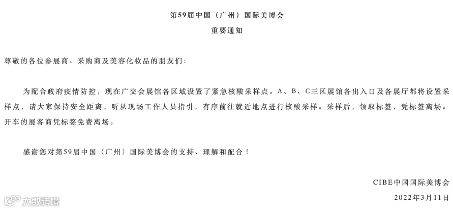 3月11日,美博会官方微信公众号发布重要通知,要求参展人员有序前往就近地点进行核酸采样。通知内容如下: