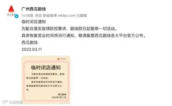 广州西瓜剧场11日下午发布临时闭店通知。通知称“为配合落实疫情防控要求,剧场即日起暂停一切活动。具体恢复营业时间将另行通知,敬请留意西瓜剧场各大平台官方公布。”