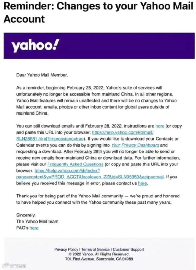 此前,雅虎曾宣布,2021年11月1日起,用户将无法在中国内地使用雅虎的产品与服务,但彼时在中国内地用户仍然可以登录已有的邮箱账户。