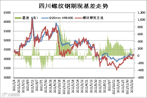 统计数据显示,成都建筑钢材现货价格与上期所螺纹钢价格存较强联动性,基差正常波动区间为-100-300元/吨。本周现货价格弱于期货,2月24日成都Φ20mmHRB400现货价为4250元/吨,RB2305合约期价为4224元/吨,基差26元/吨,周环比-17元/吨。