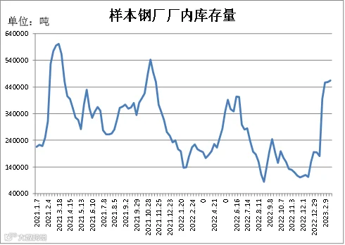 据四川省钢材流通协会对四家样本钢厂关于建材厂内库存统计数据显示,截止2月23日,A、C较上周分别减少4000吨、10000吨;B、D较上周分别增加6854.802吨、10000吨。四家样本钢厂厂内总库存量为464000吨,周环比增加5855吨。