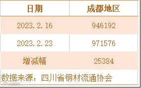 据四川省钢材流通协会统计,截止2月23日成都地区样本库房中螺纹钢及线材库存总量为971576吨,较上周增加25384吨,较去年同期增加171076吨。本期社会库存由降转增,由于产量继续增加,而需求释放弱于预期。