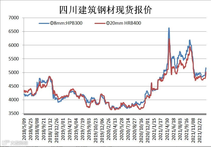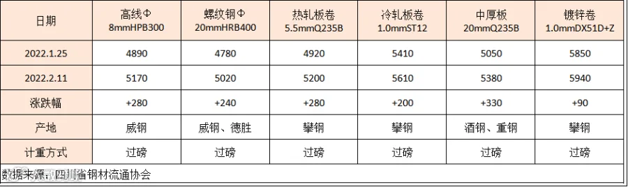 据四川省钢材流通协会对成都现货市场监测显示,本期(1.28-2.11)建筑钢材价格大幅走高,因节后原材料偏强运行提高炼钢成本,钢厂普遍上调出厂价。2月11日,成都地区Φ20mm HRB400螺纹钢价格为5020元/吨,较1月25日涨240元/吨;Φ8mm HPB300高线价格为5170元/吨,涨280元/吨。