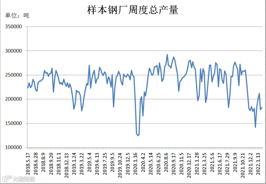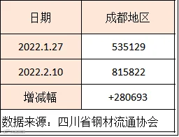 (1月28日-2月10日)四川省钢材流通协会对四家样本钢厂关于建材产量统计数据显示,本周A、C较上周分别增加1000吨、6400吨;B较上周减少2724.11吨;D产量为0。四家样本钢厂总产量为183137吨,周环比增加4676吨。