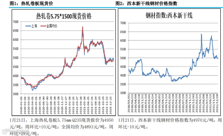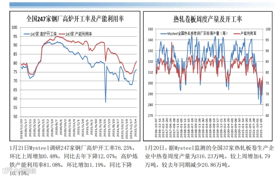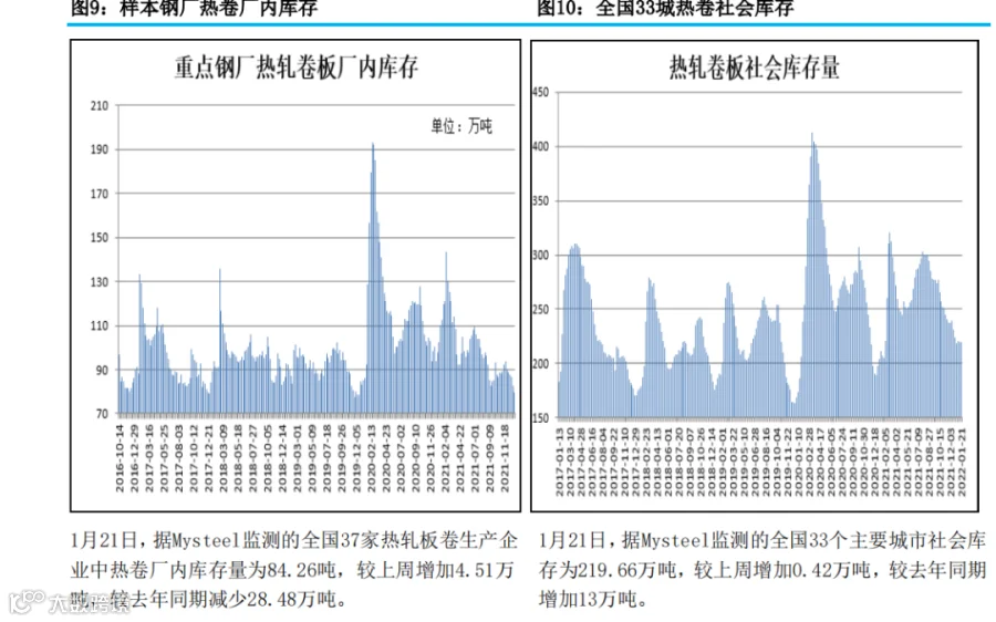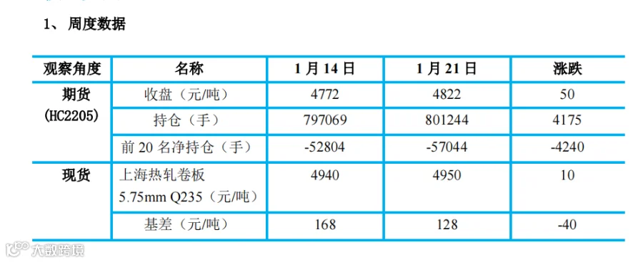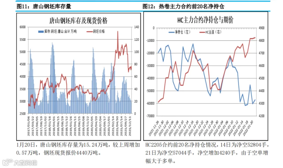 周度观点策略总结:本周(1.14-1.21)热轧卷板期货震荡偏强。由于终端需求保持低迷,叠加周初宏观数据表现不佳,热卷期价一度承压,但随着发改委表示将适当超前开展基础设施投资,及央行称要把货币政策工具箱开得再大一些,另外唐山错峰生产再加严,冬奥会期间限产力度达30%,支撑热卷期价逐步走高。本期热卷周度产量及库存量均有所回升,但幅度不大。下周(1.21-1.28)为节前最后一周,现货市场休市在即,叠加雨雪天气,运输和交易均有较大影响,市场进入相对停滞状态。考虑到近期价格涨幅较大,在缺乏需求支撑情况下,期价上行空间或受到抑制,可区间操作。