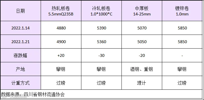 据四川省钢材流通协会对本周成都现货市场监测显示;热轧板卷较上周价格上涨20元/吨;冷轧板卷较上周价格下跌30元/吨;中厚板价格较上周下跌20元/吨,镀锌卷价格较上周价格持平。