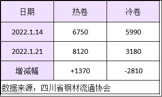 本周四川省钢材流通协会对样本钢厂关于板材出货量统计数据显示,热卷出货量6750吨,较上周减少1820吨。冷卷出货量5990吨,较上周减少430吨。