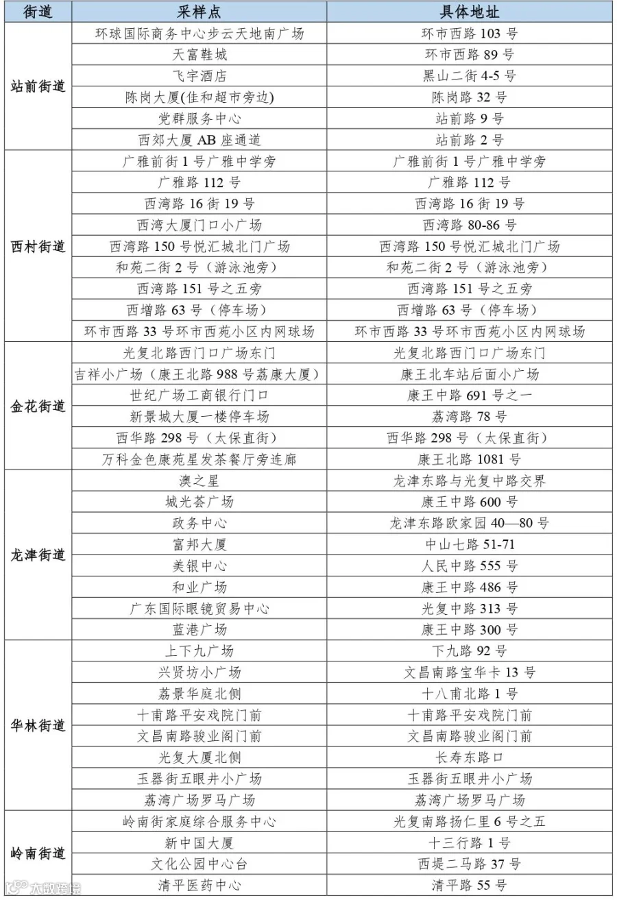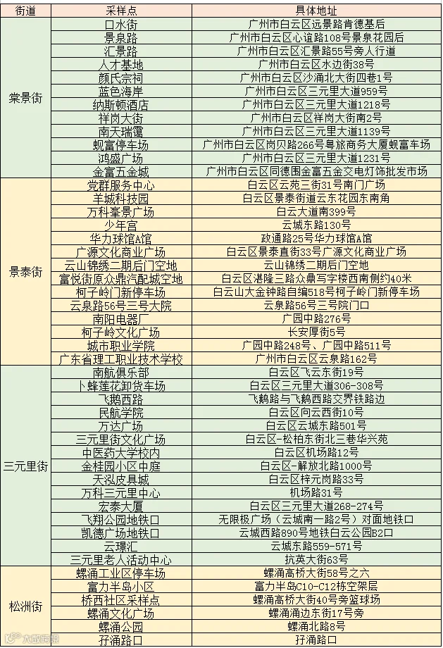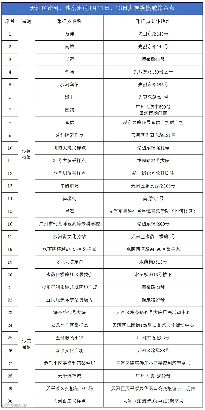 天河区沙河、沙东街道全员核酸检测点,详见下表。