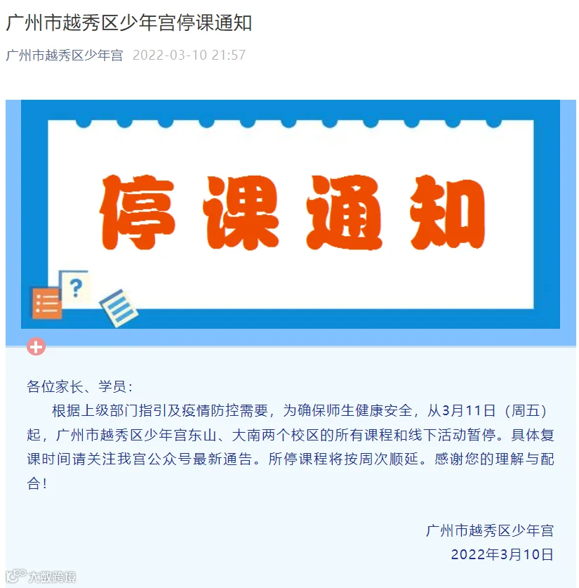 3月10日晚,越秀区少年宫发布停课通知。根据上级部门指引及疫情防控需要,为确保师生健康安全,从3月11日(周五)起,广州市越秀区少年宫东山、大南两个校区的所有课程和线下活动暂停。具体复课时间请关注最新通告。所停课程将按周次顺延。