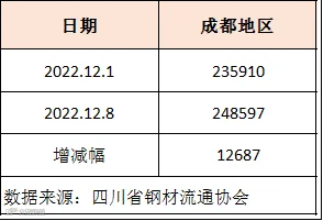 据四川省钢材流通协会统计,截至12月9日,成都地区样本库房中螺纹钢及线材库存总量为248597吨,较上周增加12687吨,较去年同期减少150641吨。本期社会库存量继续回升,下游采购放缓,同时省外资源增多。