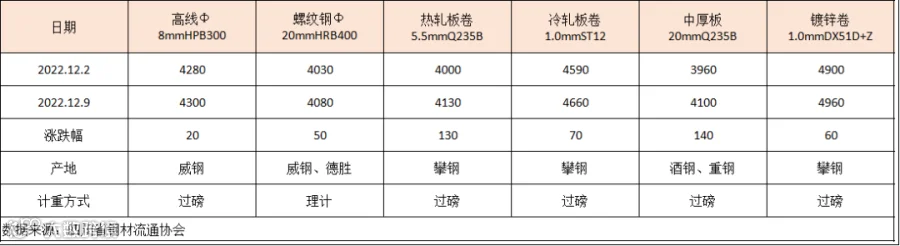 据四川省钢材流通协会对成都现货市场监测显示,本期建筑钢材价格继续上调,因房地产行业利好政策继续提振市场信心,同时随着炉料走高,炼钢成本上移,钢厂普遍挺价。12月9日,成都地区Φ20mm HRB400螺纹钢价格为4080元/吨,较12月2日涨50元/吨;Φ8mm HPB300高线价格为4300元/吨,涨20元/吨。