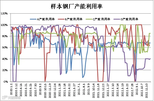 (12.2-12.9)四川省钢材流通协会对四家样本钢厂关于建材产能利用率统计数据显示,D较上周上调1%;B下降9.95%;A、C较上周持平。