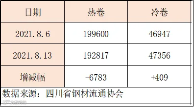 据四川省钢材流通协会统计,本周成都地区样本库房中热卷库存量为192817吨,较上周减少6783吨。冷卷库存量为47356吨,较上周增加409吨。