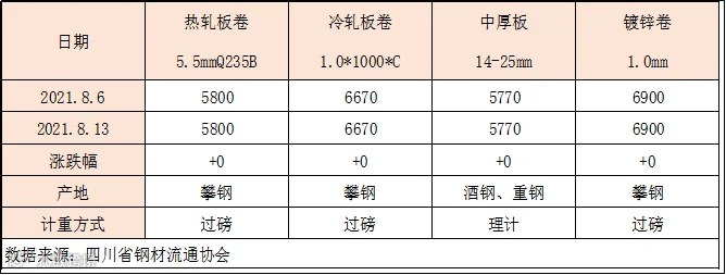 据四川省钢材流通协会对本周成都现货市场监测显示,所以品种均与上周价格持平。