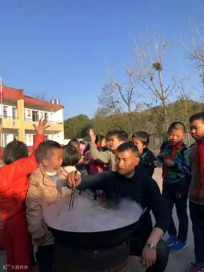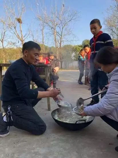 去年9月3日,开学的第三天,章站亮买来一口崭新的大铁锅,决定每天下午放学前为孩子们做一顿美味可口的营养餐。不出所料,这顿回家前吃的饭,受到孩子们的热烈欢迎。孩子们也会来帮忙,洗菜、生火、摆碗筷、收垃圾。
