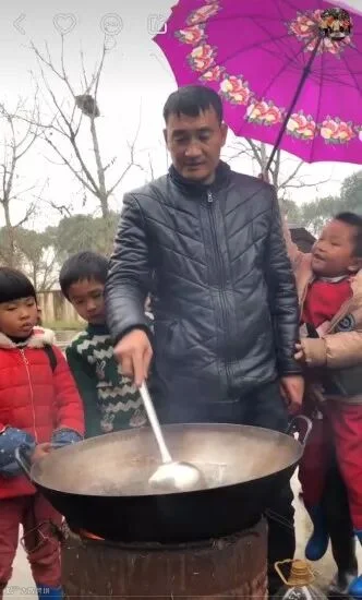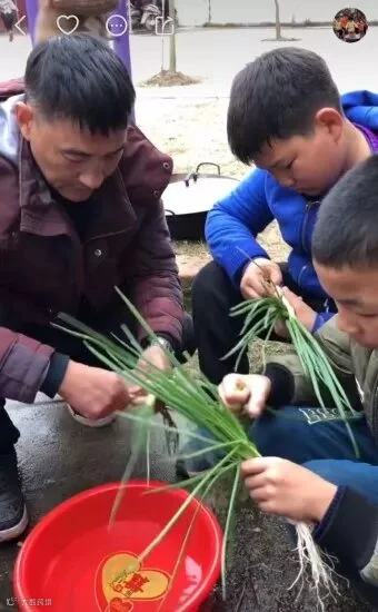 一天,孩子们和他合作煮了一锅鸡蛋肉丝面。孩子们抱着枯干的树叶到灶台引火,他烧火并逐个步骤地教孩子们下面。这个热腾腾的视频,至今播放量超过了102万。