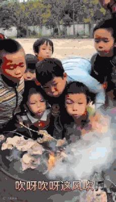 开始点火,孩子们鼓足腮帮子吹气;炊烟升起,这是美食的信号,章站亮和孩子们开心地欢呼起来。