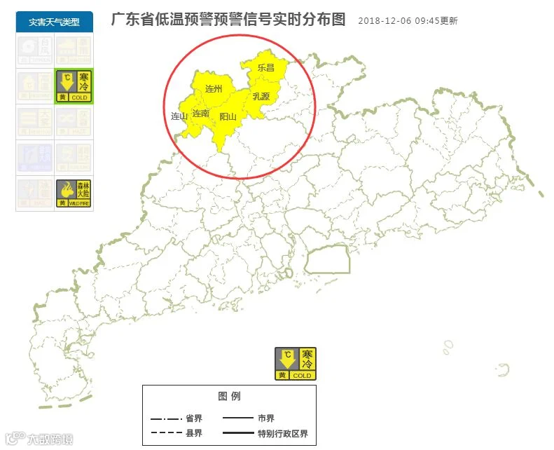 从昨天下午开始,乳源、阳山、乐昌、连州、连山、连南6个地方先后发布了入秋以来第一个寒冷黄色预警信号,意味着24h内气温急剧下降10℃。