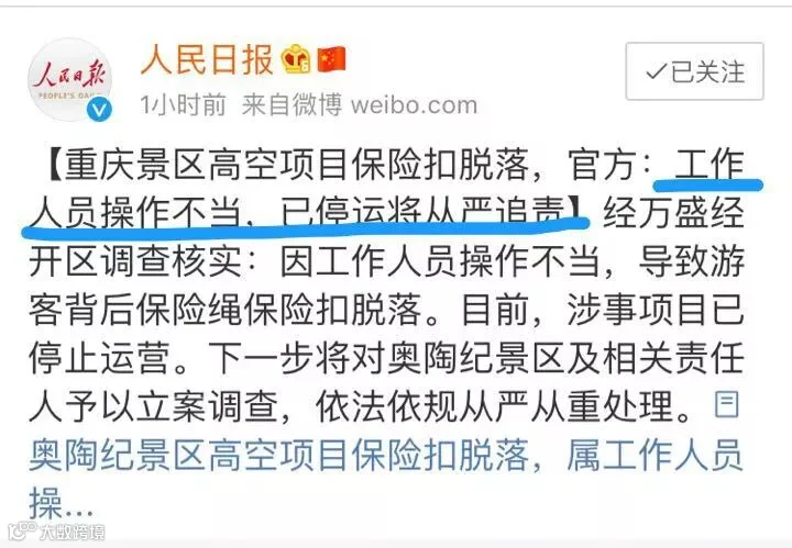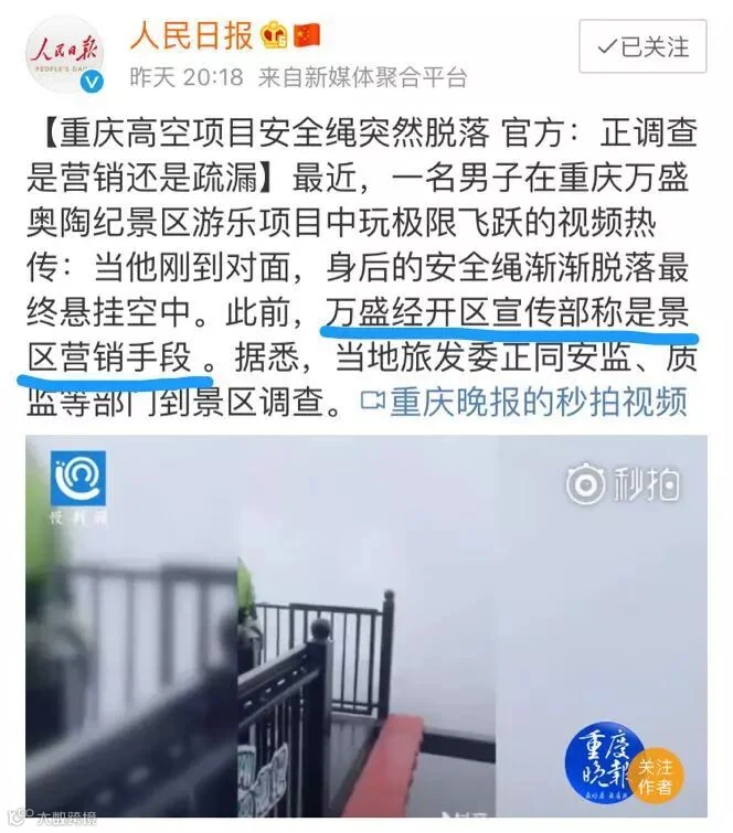 事发后,万盛经开区党工委、管委会高度重视,责令认真调查,严肃处理;责成区旅发委牵头,会同安监、公安等部门组成联合调查组开展调查。经查:10月1日12:53分,一名游客在奥陶纪景区体验极限飞跃项目时,因工作人员操作不当,背后保险绳保险扣脱落,周围游客录制并上传网络。