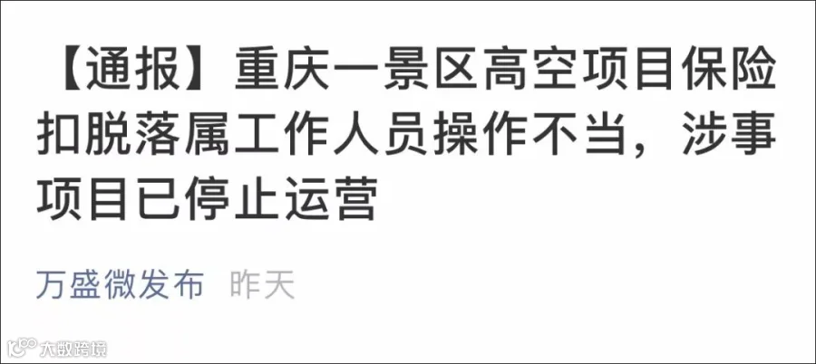 经万盛经开区调查核实,游客背后保险绳保险扣脱落,系工作人员操作不当。目前,涉事项目已停止运营。