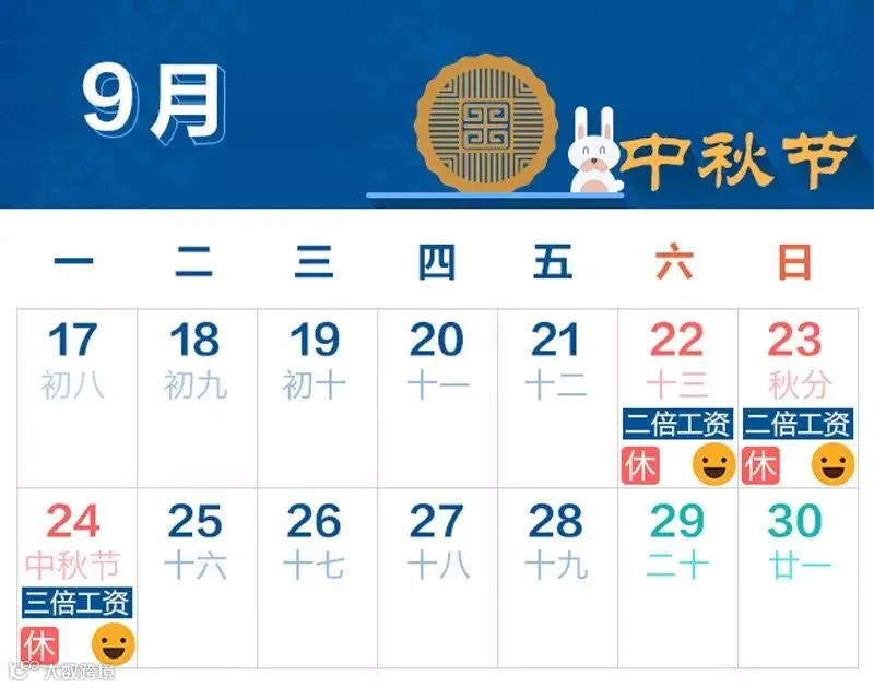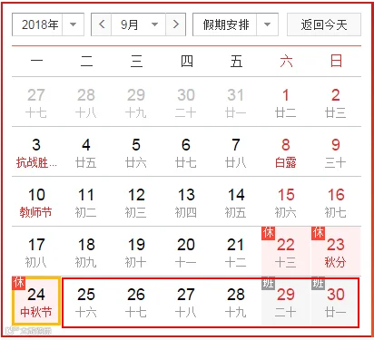 中秋节假期:9月22日—24日,其中,9月22日—23日为周末,9月24日(星期一)补休;