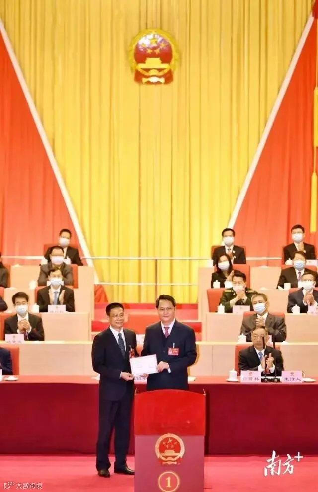 大会主席团常务主席、市委书记、市人大常委会主任殷昭举(前排右一)为新当选的清远市市长温文星(前排左一)颁发当选证书。曾亮超 摄