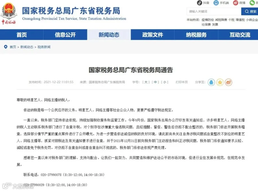 国家税务总局北京市税务局和广东省税务局12月22日发布公告:依法纳税是每一个公民应尽的义务。明星艺人、网络主播等社会公众人物,更要严格遵守税法规定。