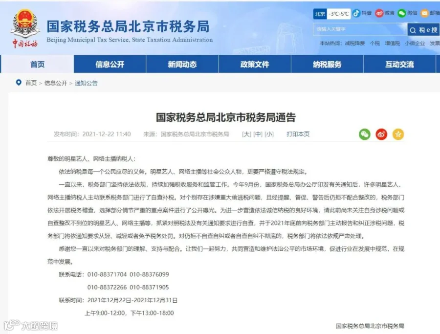 12月22日,浙江省税务局、上海市税务局发布通告称,为进一步营造依法诚信纳税的良好环境,请此前尚未关注自身涉税问题或自查整改不到位的明星艺人、网络主播等,抓紧对照税法及有关通知要求进行自查,并于2021年底前向税务部门主动报告和纠正涉税问题,税务部门将依通知要求从轻、减轻或者免予税务处罚。对仍拒不自查自纠或者自查自纠不彻底的,税务部门将依法依规严肃处理。