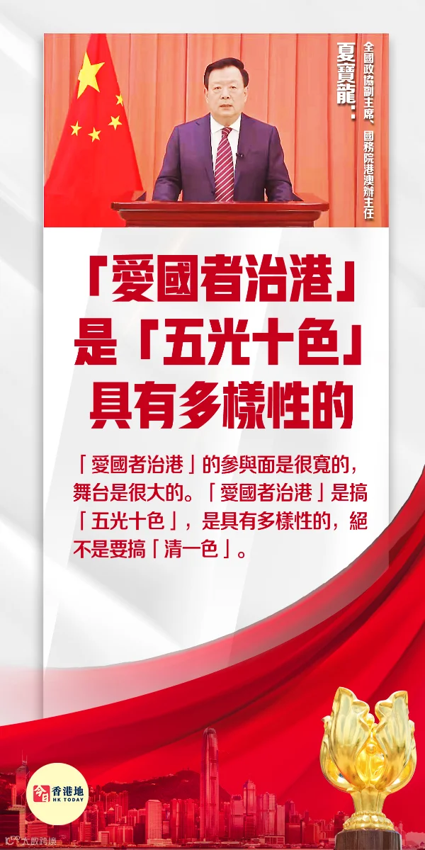 夏宝龙在12月6日的讲话中指出,“‘爱国者治港’是搞‘五光十色’,是具有多样性的,绝不是要搞‘清一色’。”对此,深圳大学港澳基本法研究中心主任邹平学认为,夏宝龙的讲话是对此前存在的‘“爱国者治港’是‘清一色”’这种误解的再次澄清。邹平学说,任何国家的管治团队都必然是由爱国者构成的,“任何国家的选举制度都不会让不爱国、与主体制度相对抗的人通过审查”,因此“爱国者治港”实质上是一种政治常识。他表示,夏宝龙的这次讲话就是对这种常识的再次阐释,意在正本清源、释疑解惑。邹平学解读夏宝龙讲话认为,“‘爱国者治港’是在爱国的旗帜下‘五光十色’”。在排除掉乱港反中势力之后,在爱国的前提之下,香港新选举制度会体现出巨大的包容性。